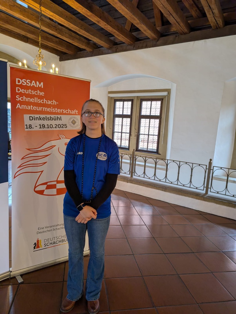 Zwischen dem 18.10.2025 und dem 19.10.2025 fand die Deutsche Schnellschachamateurmeisterschaft in Dinkelsbühl statt. In der Gruppe G ging Juliana Spengler für die Spgem Kötz/Ichenhausen an den Start. Hierbei konnte Juliana 4,5 Punkte aus 9 Runden erzielen und sich damit den 16. Platz von 31 Teilnehmern in ihrer Gruppe sichern. Damit landete die junge Ichenhausenerin vor Alisia Engel (4 Punkte) und Jacklin Leidner (3 Punkte), sodass sie sich über den Titel Deutsche Amateurmeisterin- Gruppe G und ein Preisgeld von 40€ freuen durfte.